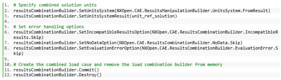 The unit system associated with the combined solution output is setup to be read in from an existing file, ensuring unit consistency. The unit_ref_solution variable can be any of the solution objects associated with the limit load cases. Error handling conditions are skipped in our case, but logic can be added for customizing program behavior when running into these types of errors. Lastly the ResultsCombinationBuilder object data is committed to the active session and thereafter removed from memory.