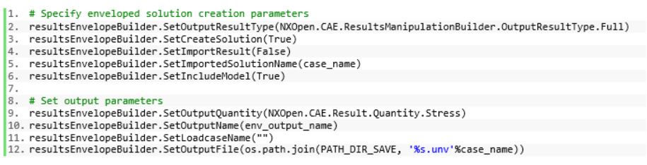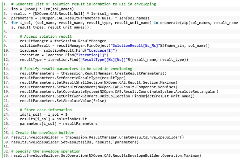 The automation of load case enveloping is very similar to load case combination. To begin, the session object is used to create a ResultsEnvelopeBuilder object. The first step requires passing in the result data that will be used in the load enveloping, an ID label, and the result parameters defining the data and operations used to envelope across the input load cases.
