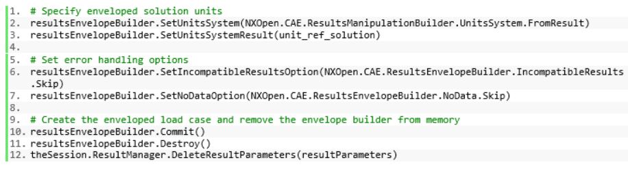 The unit system associated with the enveloped solution output is setup to be read in from an existing file, ensuring unit consistency. The unit_ref_solution variable can be any of the solution objects associated with the limit load cases. Error handling conditions are skipped in our case, but logic can be added for customizing program behavior when running into these types of errors. Lastly the ResultsEnvelopeBuilder object data is committed to the active session and thereafter removed from memory.