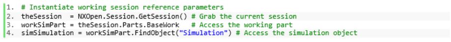 The next step is to instantiate the working session reference parameters. First, we use the NXOpen package to grab the active session object. Second, we use the session object to access the active work part object. Third, we use the active work part object to access the associated simulation object.