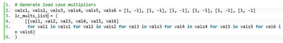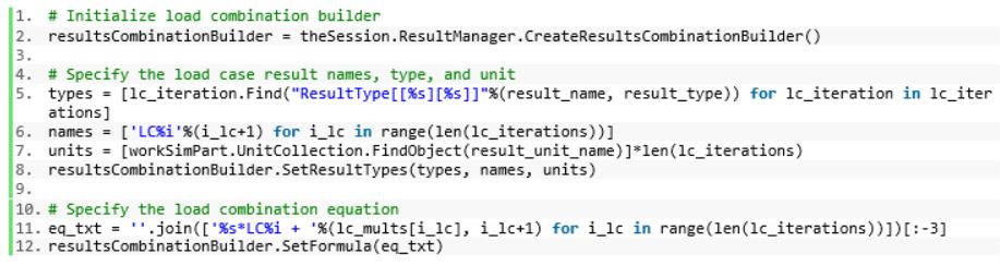 After loading and setting up pointers to the load cases we wish to combine, the array of load combination multipliers is generated using a Python list comprehension. This is also where we get a glimpse into the power at our fingertips when using the NXOpen + Python utility. We are not just confined to using NXOpen API commands, but are free to leverage the extensive Python third-party libraries and integrate them with existing NX/Simcenter 3D workflows to dramatically customize and extend current tool capabilities.