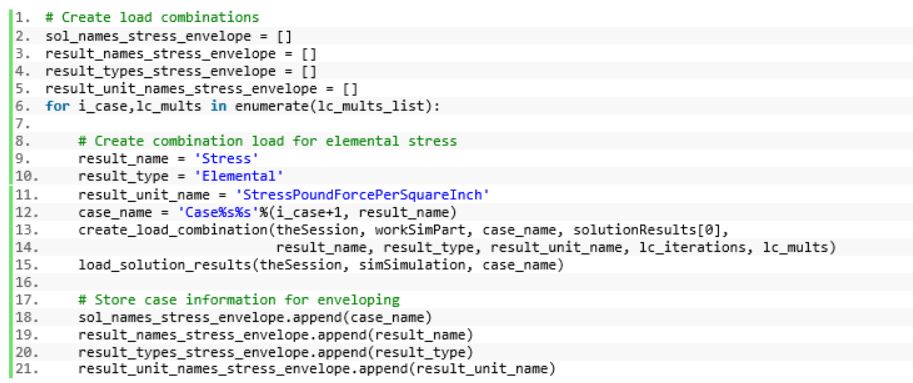 The list of load combination multipliers is iterated over and the create_load_combination function (to be discussed in Step 3) is used to combine the load case elemental stresses. After creating the combined load case, the load_solution_results function is used to load the result file into the active session. Lastly, the load combination information is stored into a running list that will be used during the enveloping step.