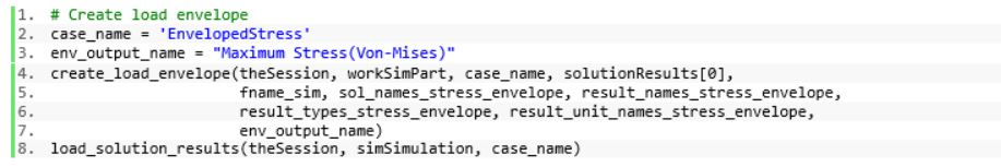 After all combined load cases have been generated and loaded into the active session, the create_load_envelope function (to be discussed in Step 4) is used to envelope the maximum Von-Mises stress across all load combinations. Lastly, the load_solution_results function is used to load the result file into the active session.