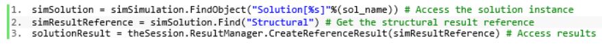 To automate result loading, we interrogate the simulation object for a solution instance that matches a name key. The name key is simply the name assigned to the solution instance in Simcenter 3D. Once we have the solution instance, we can then interrogate it for results of type Structural and then use the session object to load in results that match the solution instance name.