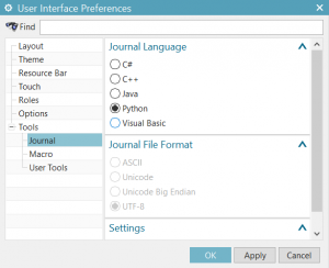 - Set the preferred programming language by going to File -> Preferences -> User Interface. Next, select Tools -> Journal from the available options and click on the radio button corresponding to programming language that should be used when auto-generating NXOpen code.