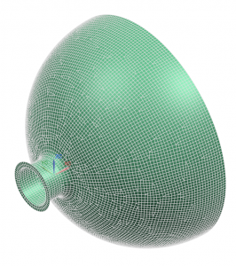 The flange connects the fuel in the tank to the propulsion system via a pipe routing network. The propulsion forces at the engine generates loads back on the flange. A conservative bound on the induced limit forces and moments in each direction is determined and taken to be ±9000 N in X, ±2000 N in Y, ±2000 N in Z, ±100 Nm about X, ±5000 Nm about Y, and ±5000 Nm about Z. To determine if the current design will yield under limit loading conditions, all possible linear combinations of the forces and moments must be analyzed. To do so, the limit force and moment in each axis direction is analyzed separately using the Nastran Static Structural solver, and load combination and enveloping is used to determine the maximum stress across all potential load combinations. Since we expect the stress concentrations to occur near the flange-dome connection, only the components near that connection are considered in the following work, as seen below.