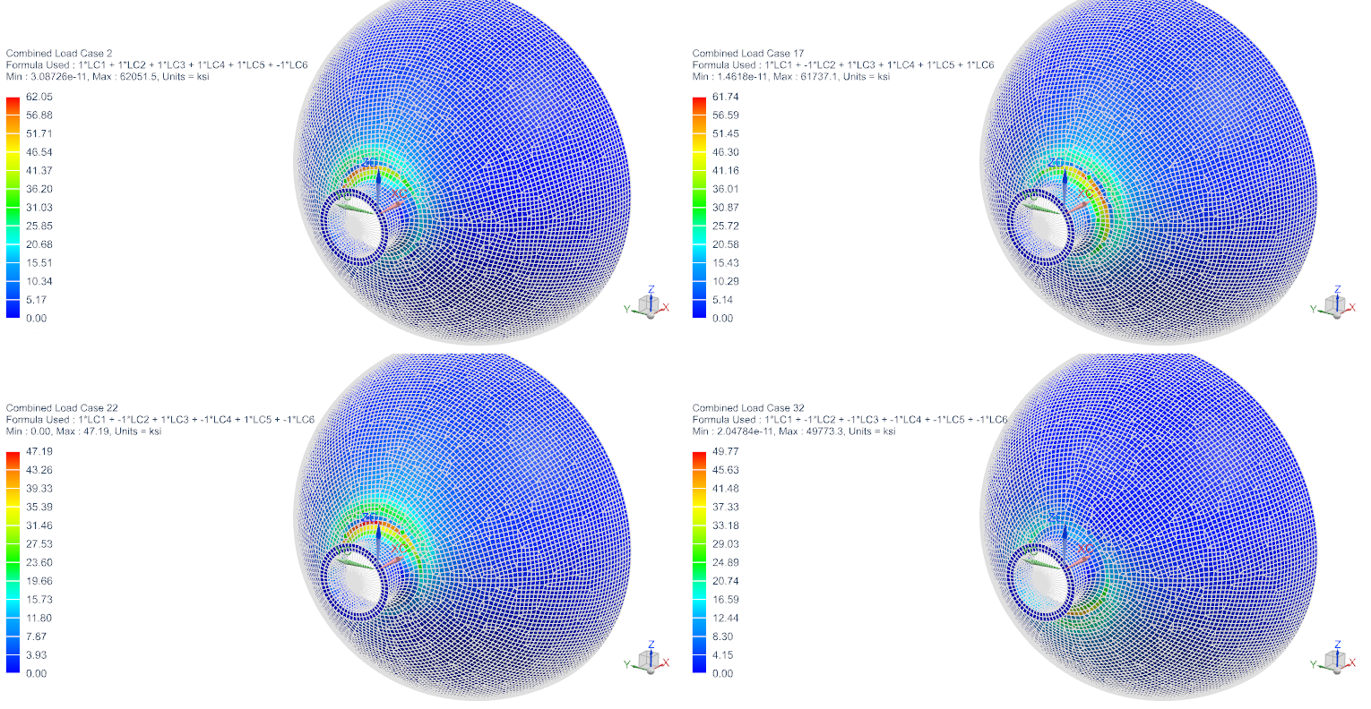 Stress contours for selected combined load cases, and the corresponding load case combination equations, are shown below: