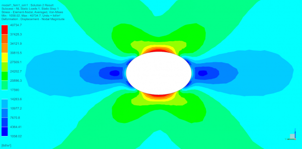 An axial load of 8,000 lbf was then applied to the model and a linear-elastic solution was run using Simcenter Nastran (formerly known as NX Nastran).  Note that M4 Engineering is an officially licensed reseller of Simcenter Nastran.